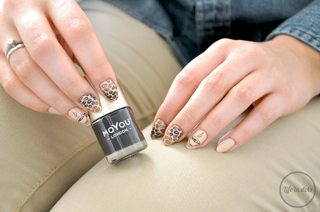 Wykonanie takiego manicure jest bajecznie łatwe, bo wymaga jedynie odpowiedniej płytki do stemplowania i trzech skomponowanych ze sobą odcieni beżu i brązu. Ja posłużyłam się płytką WhatsUp Nails B007 oraz lakierami MoYou London – Caffe au Lait, Cappucino i Toasted Mocha oraz przezroczytym stemplem MoYou. Najjaśniejszy lakier nałożyłam na wszystkie paznokcie jako bazę, a następnie stemplowałam gradientowy wzór. Jak stworzyć gradient? Na wzór wystarczy nałożyć dwa, trzy odcienie lakieru do paznokci, a potem zdrapką zdrapać kilkukrotnie lakier, aby przejście było płynne. Trzeba to robić bardzo szybko. Całość utrwaliłam specjalnym topem nie rozmazującym wzorów z MoYou.
