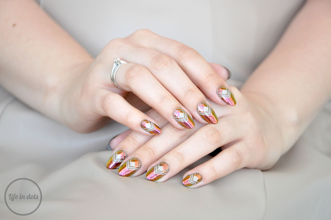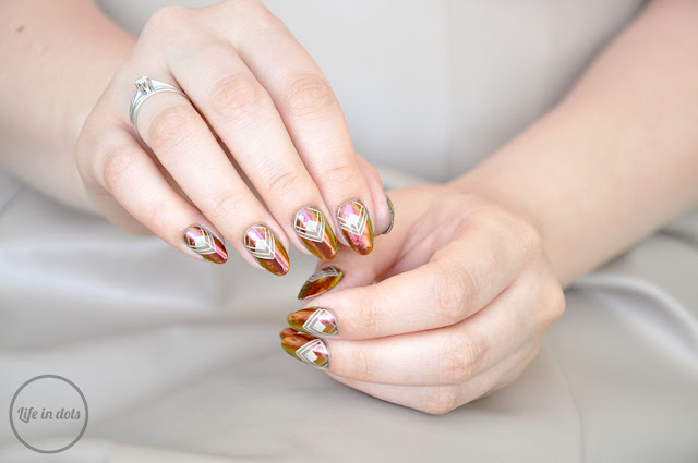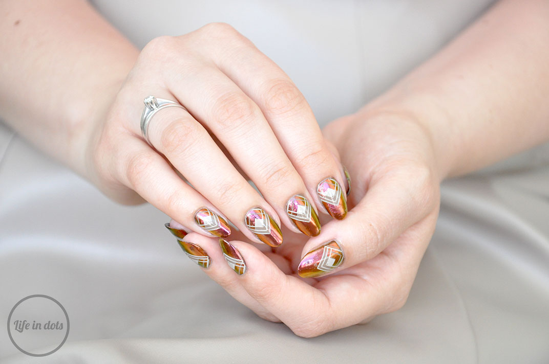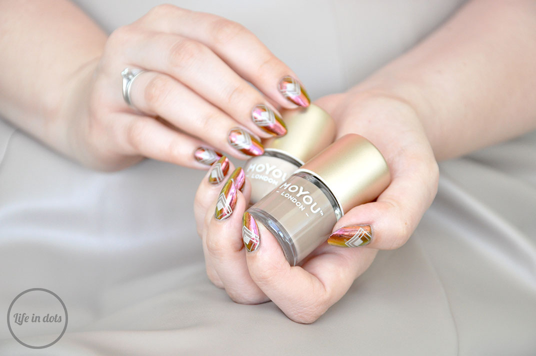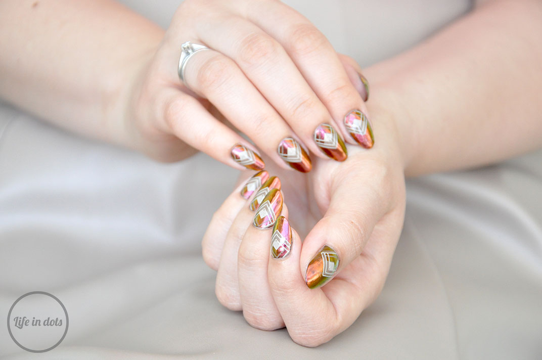 Chociaż efekt sam w sobie jest przepiękny, to ja dodatkowo pokusiłam się na stworzenie klasycznego, geometrycznego zdobienia, do którego zainspirował mnie odcień pyłku WhatsUp Nails – Sunset Powder. Puder ten mieni się zieleń, fiolet, czerwień, pomarańcz i złoto, które kojarzą mi się z afrykańską sawanną. Postawiłam więc na zdobienie w brązach i beżach, ale zamiast klasycznych plemiennych wzorów wybrałam geometrię. Posłużyłam się w tym celu płytką MoYou London Minimal 04, lakierami – Cappucino oraz Cafe Au Lait i przezroczystym stemplem. Całość ponownie porządnie utrwaliłam lakierem nawierzchniowym i voilà!