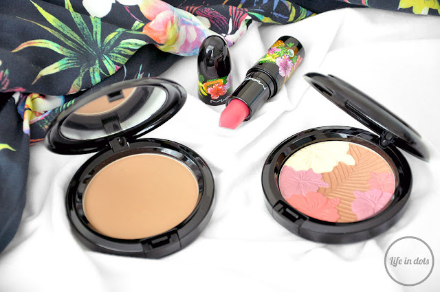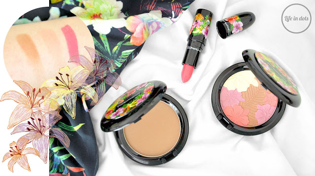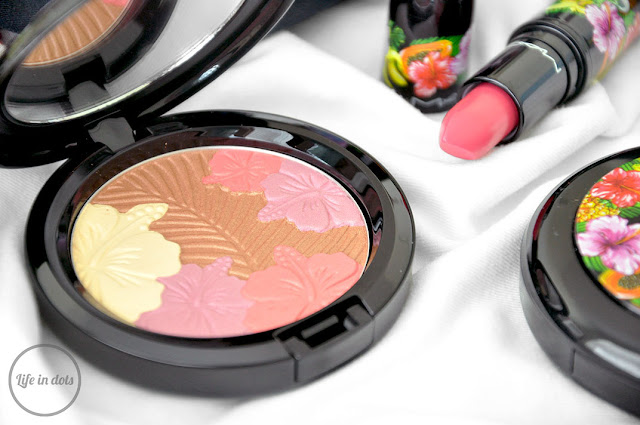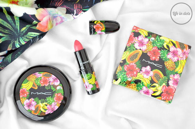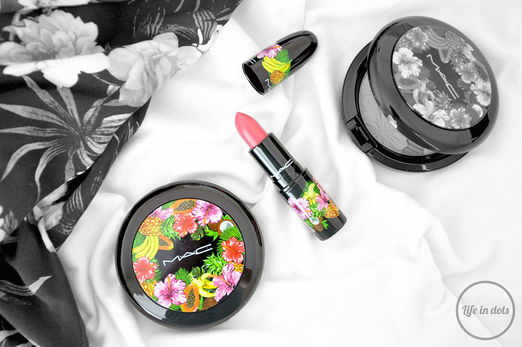 Zanim przejdziemy do iście egzotycznej zawartości pochylmy się nad tymi opakowaniami. Czyż nie są cudowne? Klasyczne czarne wzory charakterystyczne dla marki MAC w połączeniu z rajską grafiką pełną kwiatów i owoców. To połączenie jest jednocześnie klasyczne, eleganckie i zabawne. Oczu nie można oderwać, bo chociaż firmy kosmetyczne prześcigają się w tworzeniu co raz piękniejszych kosmetyków, to jednak rzadko spotyka się coś co z takim smakiem balansuje na granicy kiczu i osiąga zniewalający efekt. Chapeau bas, MAC!