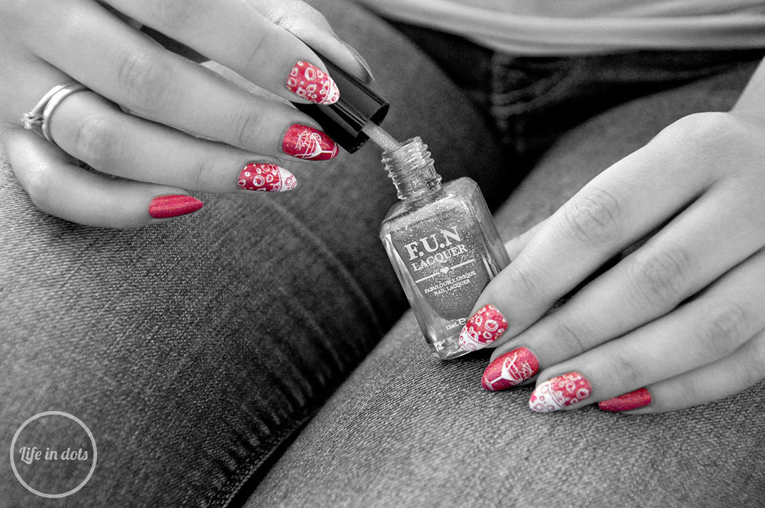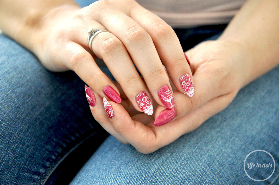 Wykonanie takiego manicure jest bajecznie łatwe i wymaga zaledwie kilku rzeczy. Ja posłużyłam się płytką WhatsUp Nails B007, białym lakierem MoYou London oraz przezroczytym stemplem tej samej marki. Jako bazę do zdobienia wykorzystałam przepiękny holograficzny lakier Fun Lacquer o nazwie Cosmpolitan w odcieniu intensywnego różu z złotym brokatem. Prawdziwe cudo. Na wyschnięty lakier stemplowałam motyw bąbelków i drinka, a następnie całość utrwaliłam specjalnym topem nie rozmazującym wzorów z MoYou.