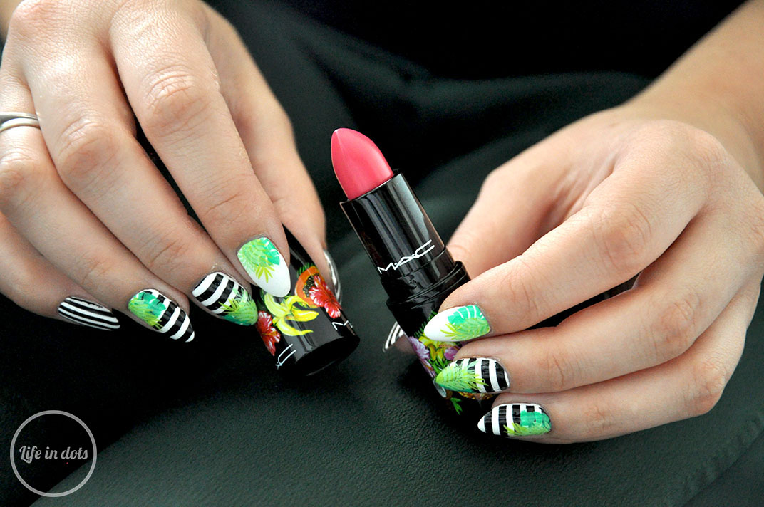 Lato nadeszło, więc czas najwyższy na tropikalne szaleństwo na paznokciach. Intensywne kolory, egzotyczne motywy z odrobiną minimalizmu. Połączenia klasycznych geometrycznych wzorów letnim szaleństwem jest stylowe, a jednocześnie kobiece i zabawne. Inspiracją dla takiego mani były opakowania MAC z kolekcji Fruity Juicy.