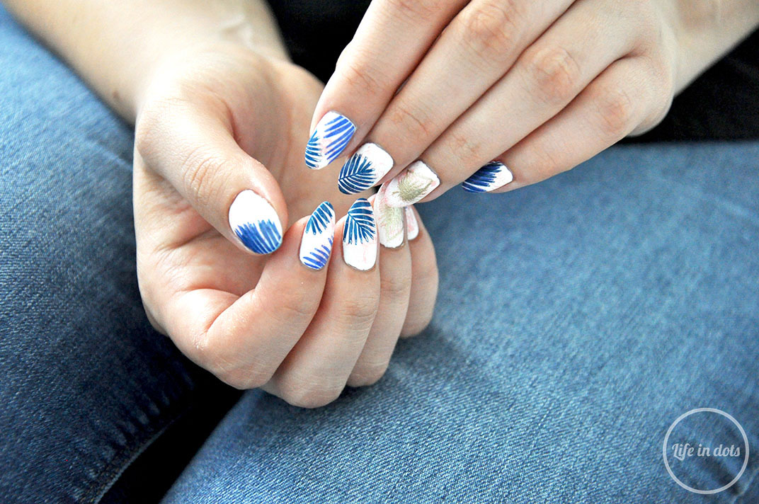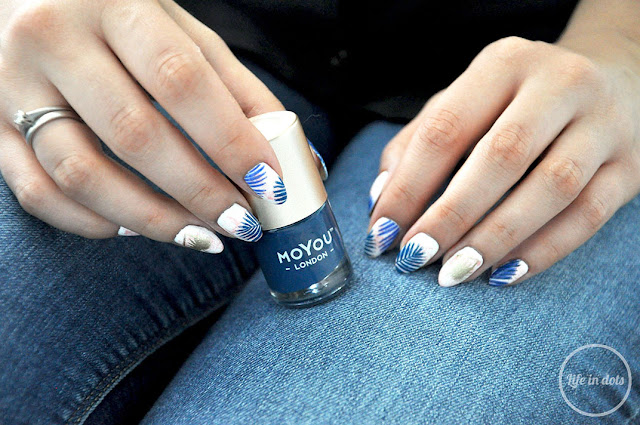 Do wykonania tego manicure posłużyłam się dwiema metodami zdobienia – czymś, co nazywa się „drybrush” i moim ulubionym stemplowaniem. Jako bazę wykorzystałam biały lakier MoYou White Knight, którym pokryłam wszystkie paznokcie. Następnie za pomocą pastelowego różu One and Only tej samej marki tworzyłam delikatne „maźnięcia” koloru dzięki technice „drybrush”. Polega ona na tym, że pędzelek lakieru należy mocno oczyścić z emalii i takim prawie suchym włosiem nakładać lakier. Efekt jest dość szorstki, nierówny i niepowtarzalny. Tak przygotowane paznokcie stanowiły bazę do stemplowania za pomocą dwóch odcieni niebieskiego MoYou – Blue Velvet i Midnight Madness, złota Liquid Gold oraz płytek do stempli Tropical 28 i 30.