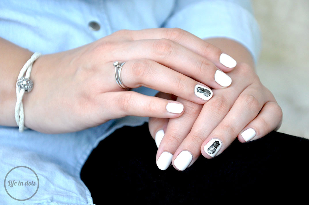 Wykonanie takiego manicure jest bajecznie łatwe i wymaga zaledwie kilku rzeczy, na czele z płytką do stemplowania z motywem ananasa (w moim przypadku WhatsUp Nails B008 Summer Seeds). Motyw ten posłużył mi do wykonania naklejki na paznokcie, która stanowi akcent na palcu serdecznym. Oprócz płytki wykorzystałam jeszcze stempel Marshmallow Sticky MoYou London, czarny lakier Black Knight MoYou i metaliczny Five-and-Ten z zimowej kolekcji OPI na 2016. Jako baza posłużył mi kremowy lakier Essie Coconut Cove z zeszłorocznej letniej kolekcji. Motyw ananasa i kokosowa nazwa? Prawie Pinã Colada!