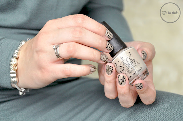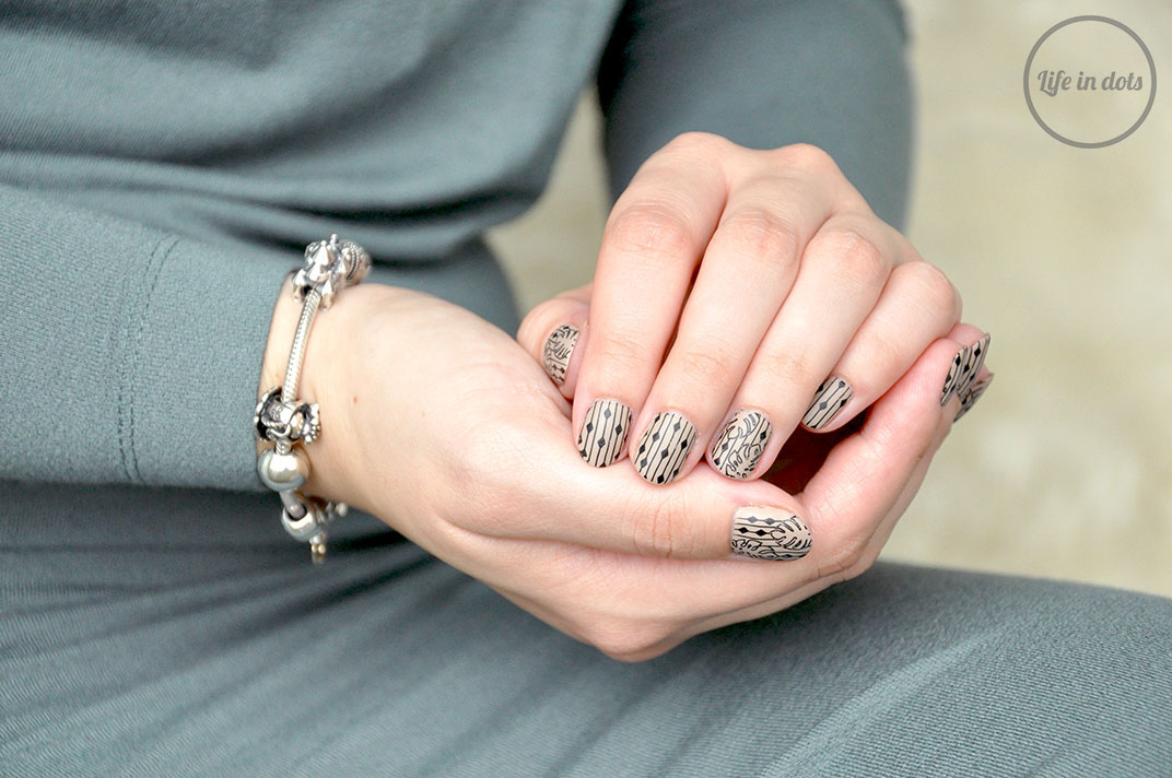 Do wykonania tego manicure wykorzystałam brudny beż OPI Coconuts Over OPI oraz czerń MoYou London Black Knight. Te dwa kolory świetnie się uzupełniają i bardzo pasują do wzoru, który wybrałam. Posłużyłam się płytką do stemplowania MoYou Trend Hunter 11 oraz przezroczystym stemplem tej samej firmy. Całość utrwaliłam porządną warstwą lakieru nawierzchniowego, aby wyrównać powierzchnię paznokcia, a następnie zmatowiłam lakierem Picture Polish G’Day Matte.