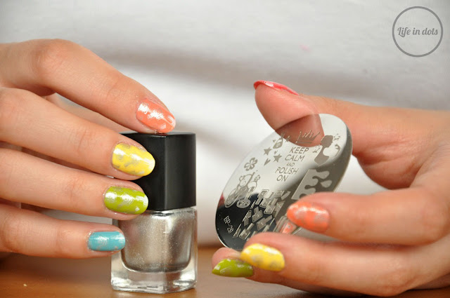 Porządkując blogowe zbiory na dysku znalazłam kilka folderów ze zdjęciami różnych zdobień, które nigdy nie miały okazji ukazać się na blogu. Niektóre fotki były prześwietlone, inne za ciemne i nie do odratowania, a część zdobień wołała o przysłowiową pomstę do nieba. W Tym zbiorze odrzuconych i zapomnianych znalazłam To. Kolorowe, wesołe zdobienie stworzone przy pomocy jednej z moich pierwszych płytek do stemplowania, które nie zasługuje na los innych wyrzuconych do kosza.