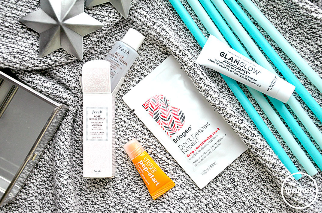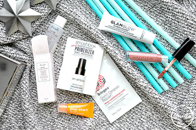 Pierwsza rzecz, która rzuca się w oczy jest brak stałej do tej pory próbki perfum. Z jednej strony to dobrze, bo niektóre zapachy zaczęły się powtarzać, z drugiej nie ma szansy na odkrycie nowych, ciekawych zapachów. Zamiast tego pojawiła się saszetka maski do włosów, która starczy osobom preferującym krótkie fryzury. Sama maska jest mi znana z poprzednich edycji, ale nie należy do moich ulubieńców. Znany jest mi też krem pod oczy Clinique oraz produkt oczyszczający GlamGlow, które szczerze uwielbiam, bo świetnie działają na mojej skórze. Nowością jest dla mnie na pewno tonik Fresh z serii różanej. Wprawdzie nie przepadam za maską do twarzy na noc tej marki, ale tonik jest zawsze mile widziany. Szczególnie w podróży, gdy rozmiar kosmetyku i jego waga ma znaczenie. W styczniu pielęgnacja dominuje w pudełeczku zostawiając miejsce tylko na jeden kryjący błyszczyk i bazo-krem do twarzy, który nie wiadomo do jakiej kategorii zakwalifikować. Czytałam o nim już wcześniej najróżniejsze opinie, więc jestem ciekawa czy sprawdzi się na mojej skórze, która pod wpływem hormonów wybitnie wymaga nawilżenia. Bazy pod makijaż stały się moimi niezbędnikami, bym jakoś wyglądała. Produkt do ust nareszcie ma inne wykończenie niż popularny w ostatnich sezonach mat, a do tego ładny, neutralny kolor. Nie ma się do czego przyczepić.
