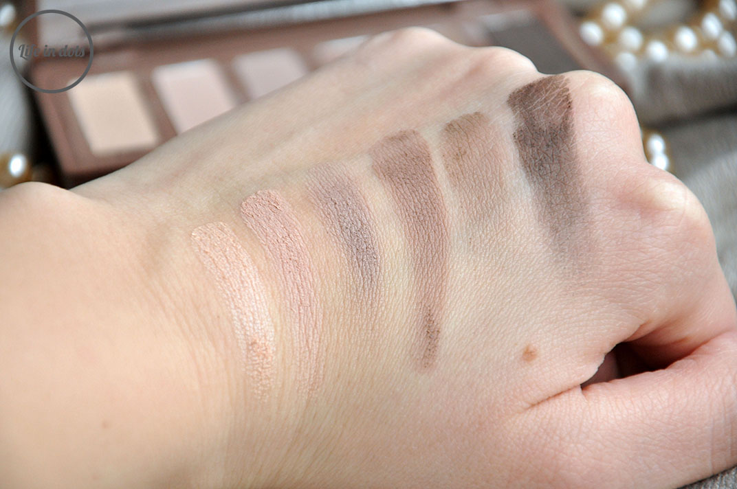 Mogłabym napisać „doskonałe” i tak właściwie to zostawić, bo w tym przypadku nie potrzeba wielu słów. Każdy jeden cień z palety jest świetnie napigmentowany, ma aksamitnie kremową konsystencję charakterystyczną dla matów tej firmy, świetnie się blenduje i jest bardzo trwały. Pylenie jest bardzo ograniczone właśnie ze względu na formułę, której brak suchości czy kredowości, ale jednak występuje, więc warto otrzepywać pędzel przed przyłożeniem go do skóry. Po nabraniu na palec cienie wydają się delikatnie mokrawe, więc dobrze przyklejają się do pędzla i powieki, a już ich niewielka ilość daje bardzo dużo koloru. To zwiększa wydajność. Dzięki zastosowaniu takiej konsystencji cienie też świetnie się blendują i robią to praktycznie same, więc podkreślenie oka zajmuje znacznie mniej czasu. Na bazie do powiek tej samej marki jak i innych firm trzymają się perfekcyjnie przez cały dzień, nie bledną, nie tracą koloru i nie zbierają się w załamaniach.
