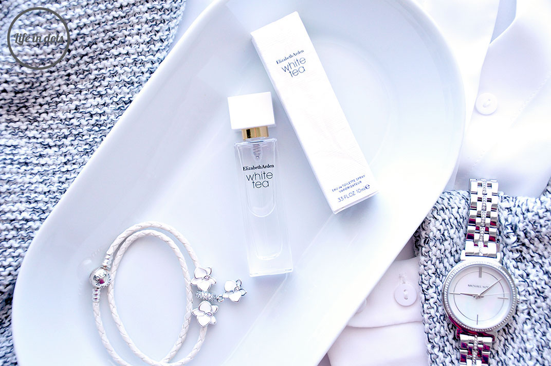 v Elizabeth Arden White Tea bardzo kojarzy mi się z zapachem, którego używałam jako nastolatka. Mowa o CK IN2U o cudownej świeżości cytrusów. White Tea jest trochę bardziej ziołowy, wodnisty, ale wciąż bardzo ciepły i promienny. Przypomina mi malutkie pączki na drzewach i ciepłe promienie słońca przy wciąż zimnym wietrze. Fantastycznie sprawdza się w te pierwsze, zimne dni wiosny, gdy na zmianę pada deszcz ze śniegiem i świeci słońce. Zapach nie jest męczący czy zbyt zobowiązujący, ma średnią projekcję i niestety słabą trwałość, ale wynagradza to jego cena. Jak przystało na drogeryjne perfumy, są one znacznie tańsze niż markowe flakoniki dostępne w perfumeriach.