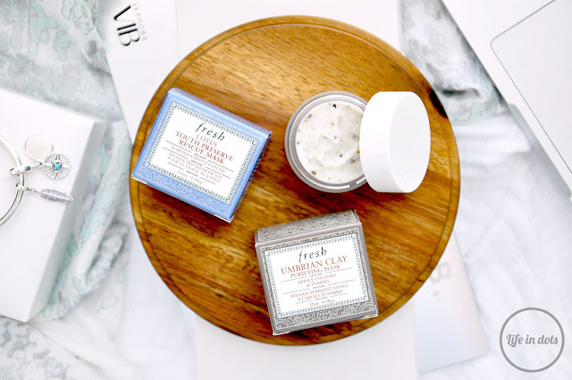 v fresh Youth Preserve Mask oraz Umbrian Clay Puryfing Mask to moje 5 minut piękna. I to dosłownie, bo produkty te zapewniają maksimum efektu w zaledwie parę chwil, co jest dla mnie szczególnie ważne w tej chwili. Po prostu nakładam maskę na twarz, myję zęby, wchodzę pod prysznic i ładniejsza cera gotowa. Zdecydowanym hitem jest Youth Preserve będąca mieszanką alg i nasion lotosu, która ma za zadanie walczyć z oznakami stresu i zmęczenia. Robi to doskonale, bo kilka minut z tym produktem daje dawkę rozjaśnienia i wygładzenia sprawiającą, że skóra wygląda młodziej i piękniej. Nie potrzeba makijażu. Umbrian Clay natomiast przeznaczona jest do skóry z tendencją do niedoskonałości i przetłuszczania. Skutecznie oczyszcza, matowi, wygładza i odświeża bez podrażnienia czy wysuszenia. Znacznie delikatniejsza wersja moich ulubionych oczyszczających masek.