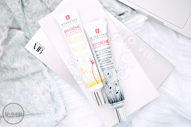 v erborian CC Crèmè à la Centella Asiatica Clair oraz BB Crème au Ginseng Clair kupiłam z ciekawości oraz jako ewentualne zastępstwo dla mojego ulubionego letniego BB kremu od It Cosmetics. Wersja CC to biały produkt, który po rozprowadzeniu ma upiększyć cerę niwelując wszelkie niedoskonałości zapewniając idealnie dobrany kolor oraz satynowe wykończenie, a także nawilżenie i ochronę przeciwsłoneczną. Zgadzam się, że skóra jest upiększona pomimo bardzo niewielkiego krycia. Niestety kolor jest bardzo różowy i zdecydowanie za ciemny jak na najjaśniejszą wersję kolorystyczną. Krem BB to tak naprawdę tylko dodatkowe krycie, bo całą robotę robi poprzednik, ale połączenie tych dwóch produktów oraz pudru rozjaśniającego Essence i odrobiny świeżej opalenizny sprawia, że skóra wygląda bardzo zdrowo i promiennie. Kolejny plus? Szybka i bezproblemowa aplikacja.